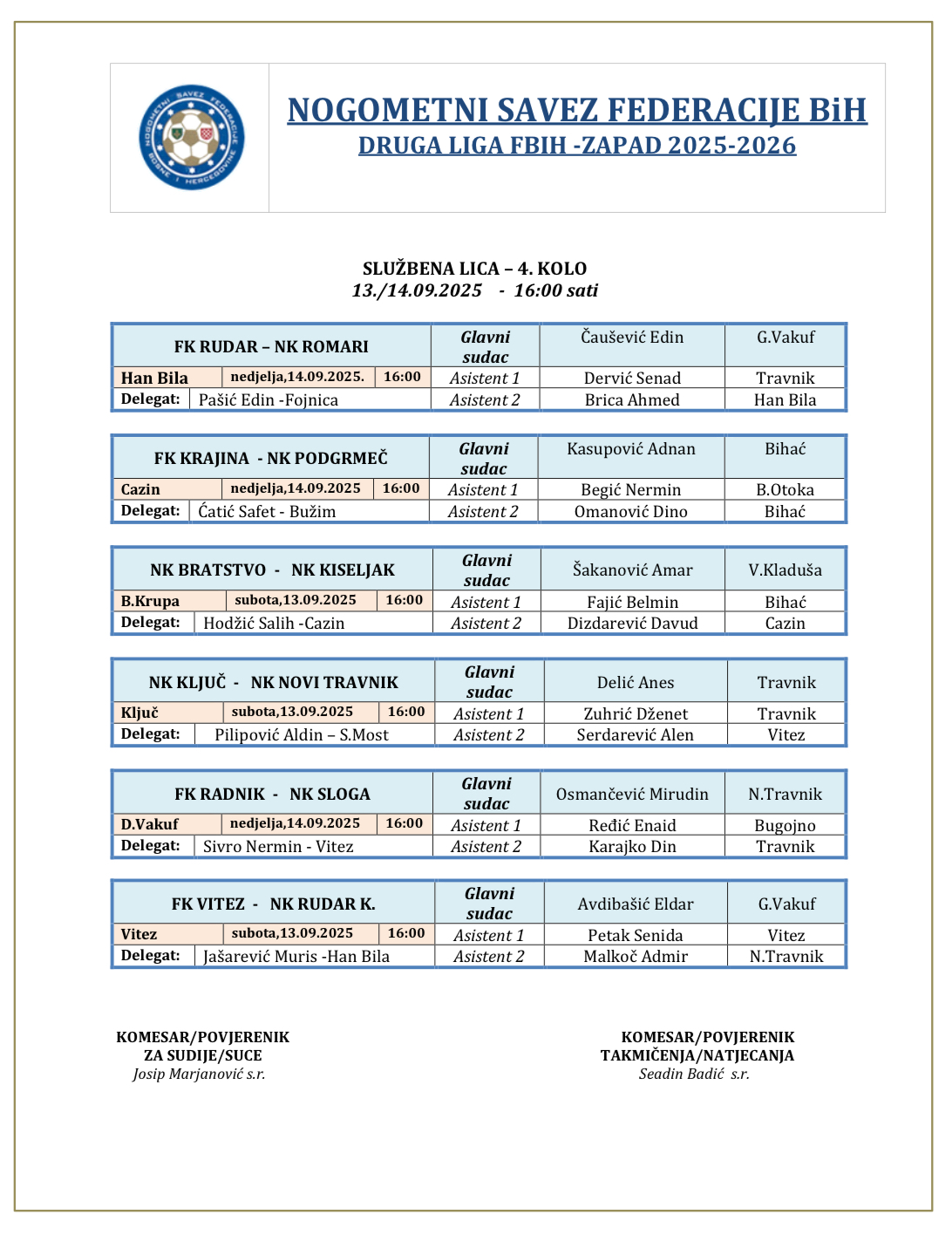 Delegiranje 4.kolo Druga liga FBiH zapad