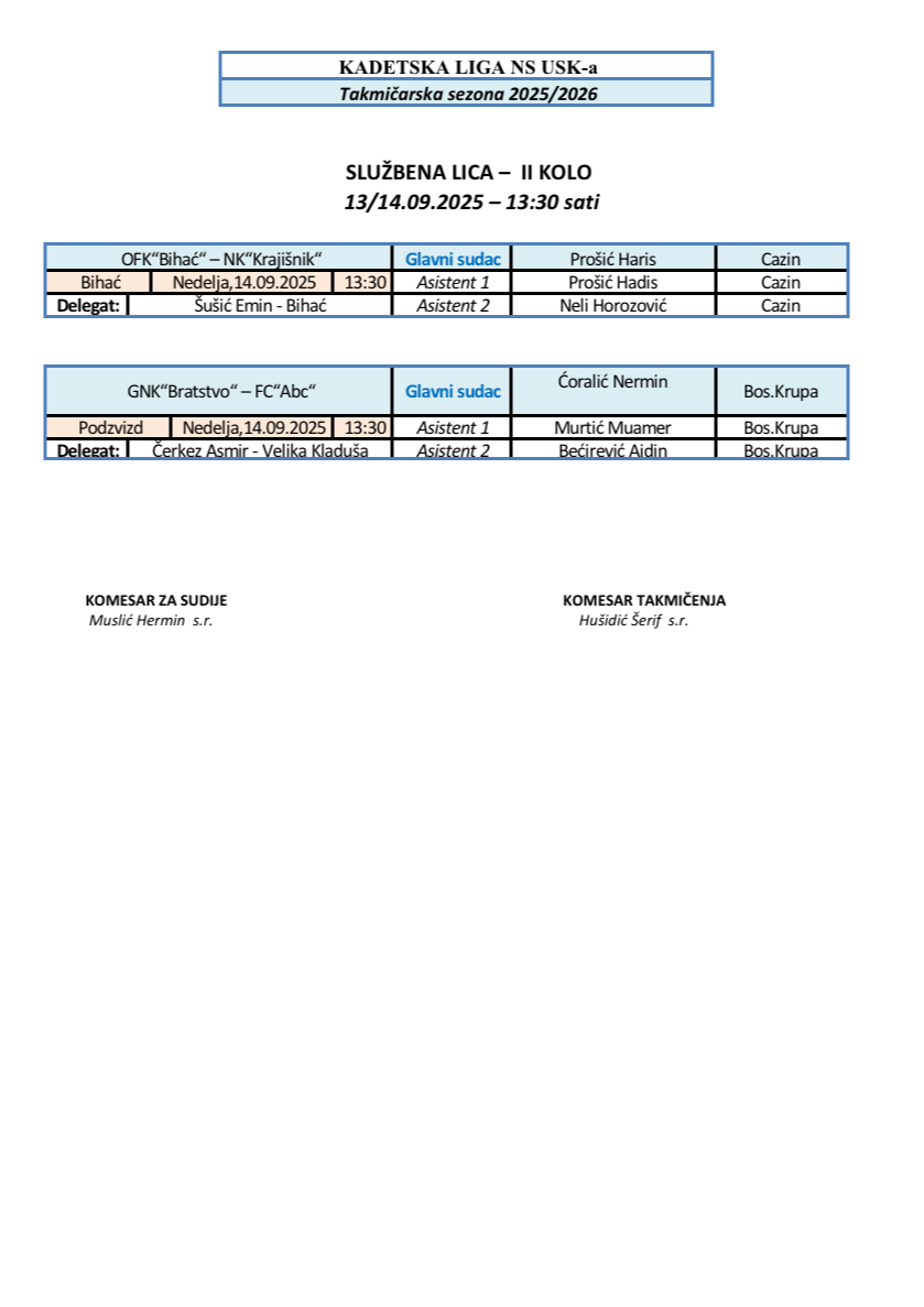 Nalozi službenih lica Kantonalna i Omladinska liga 2025/2026