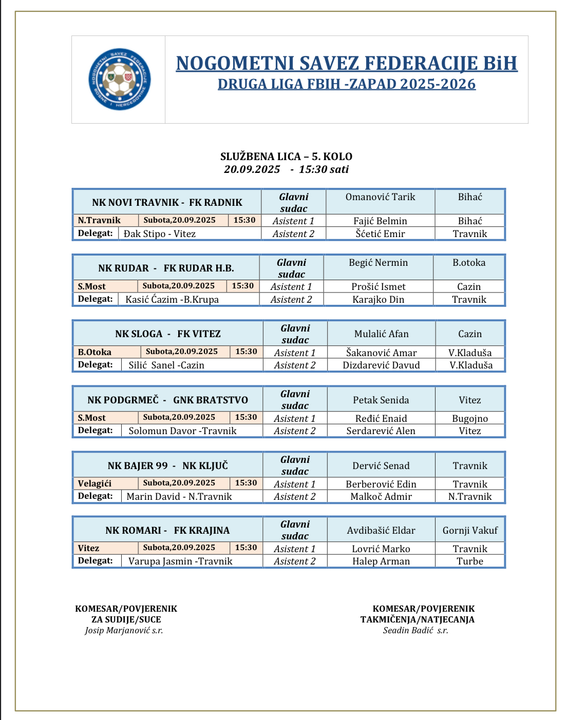 Delegiranje 5.kolo Druga liga FBiH Zapad