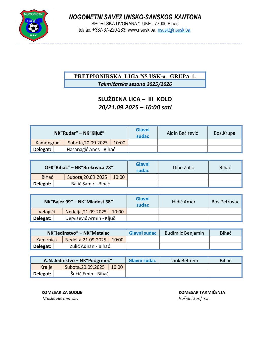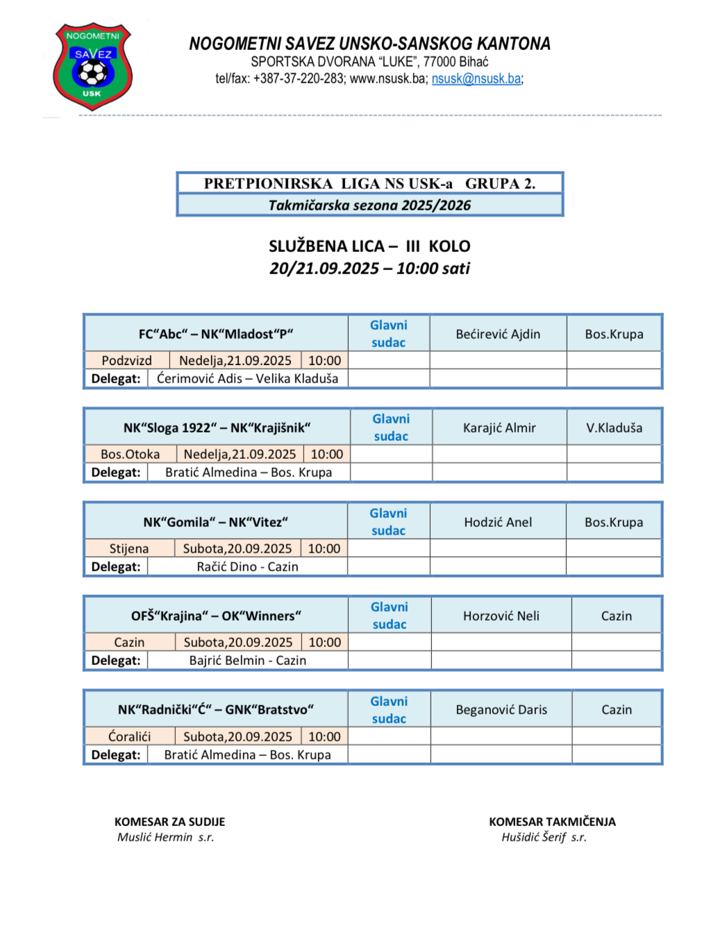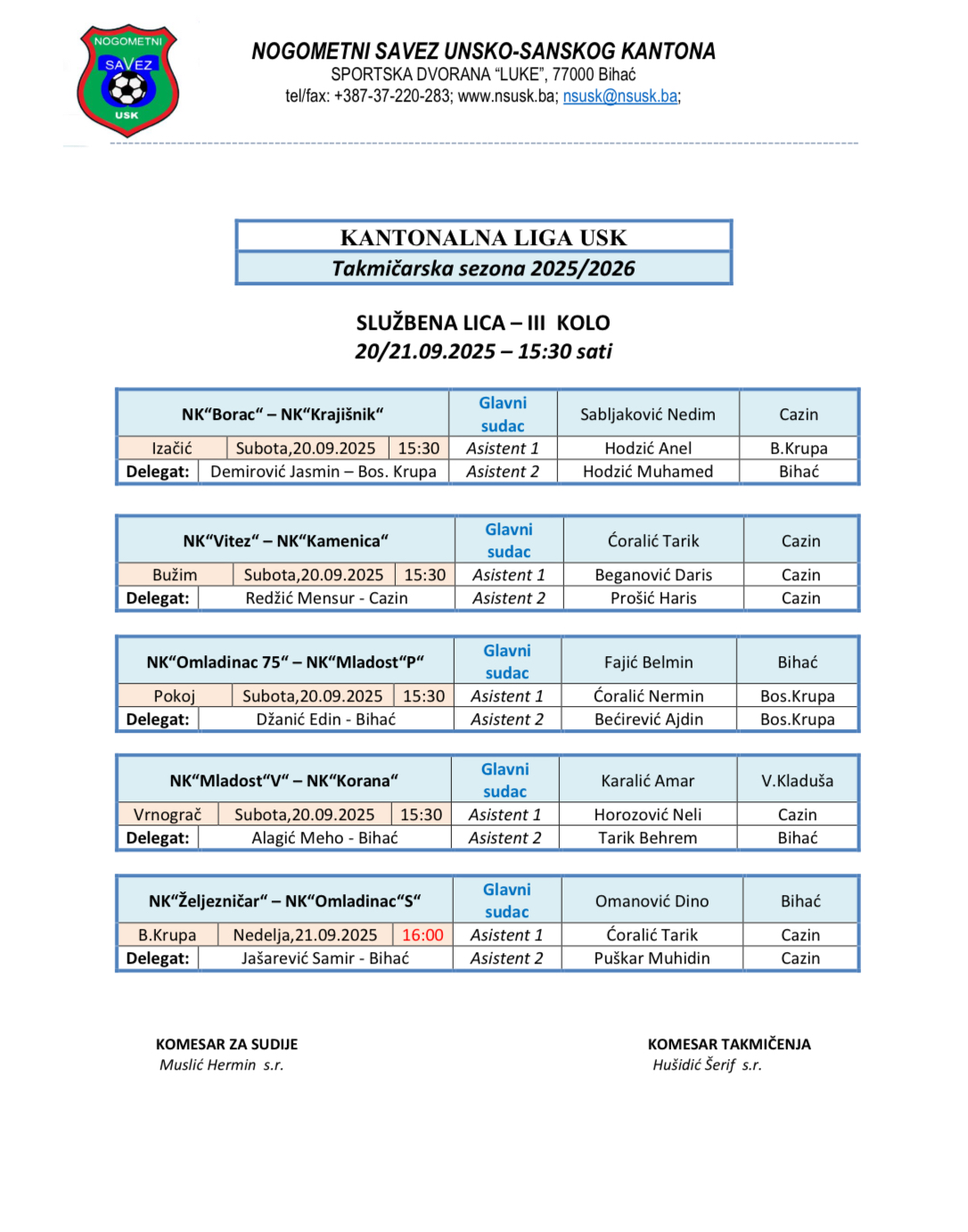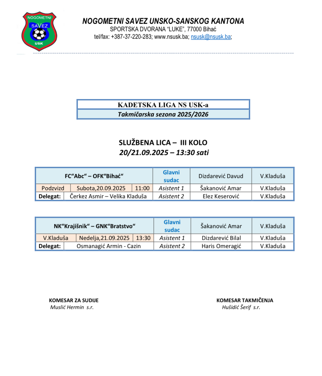 Nalozi službenih lica Kantonalna i Omladinska liga 2025/2026