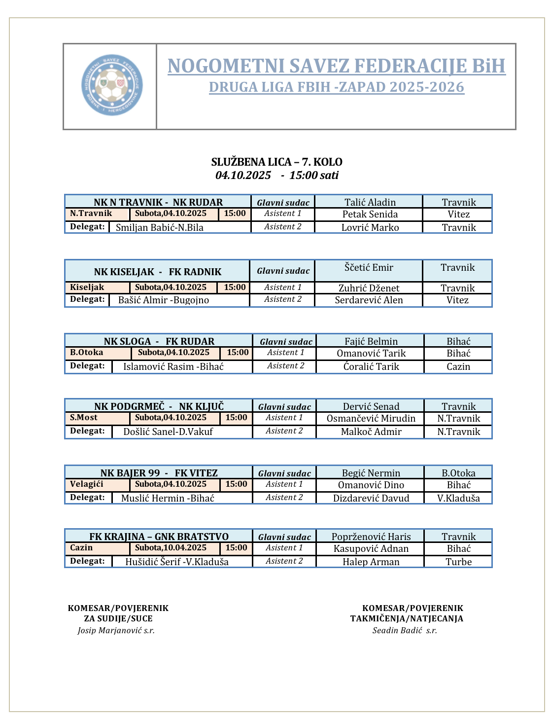 Delegiranje 7.kolo Druga liga NS FBiH Zapad
