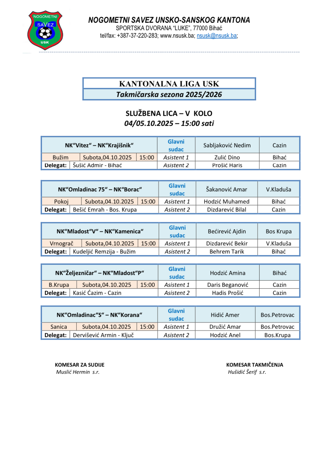 Delegiranje Kantonalna i Omladinska liga USK 5.kolo