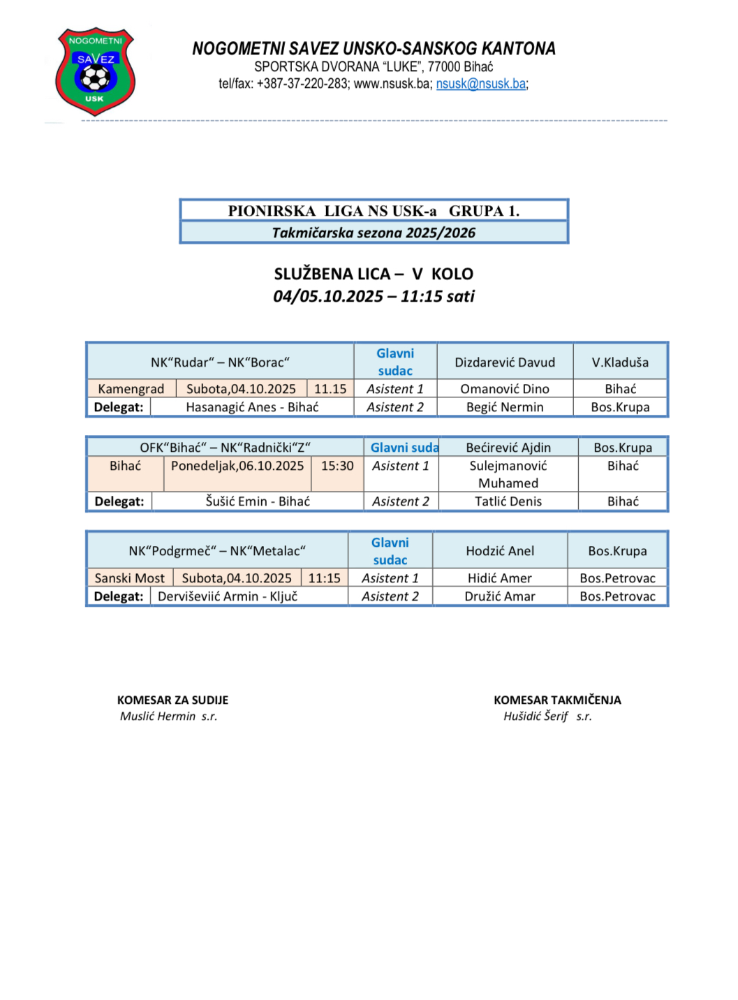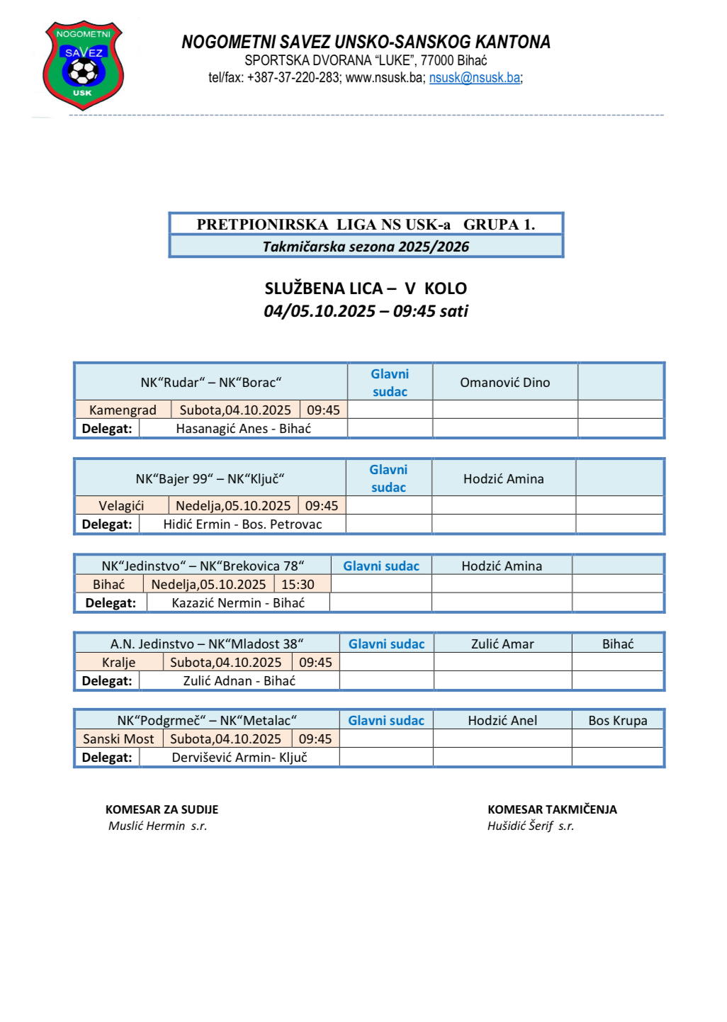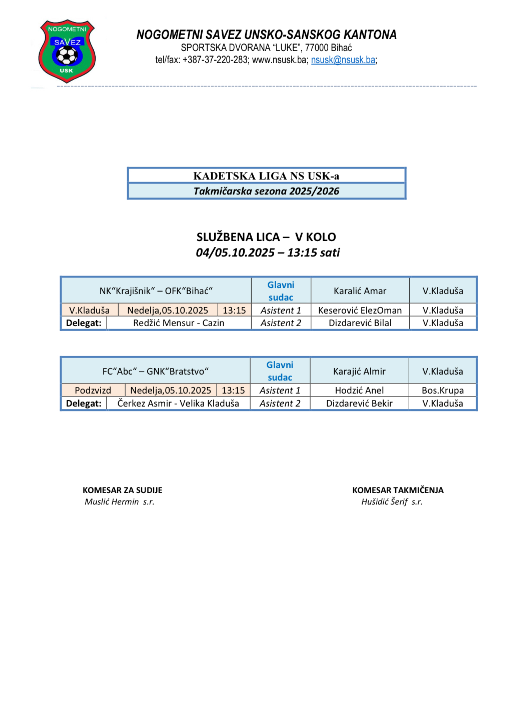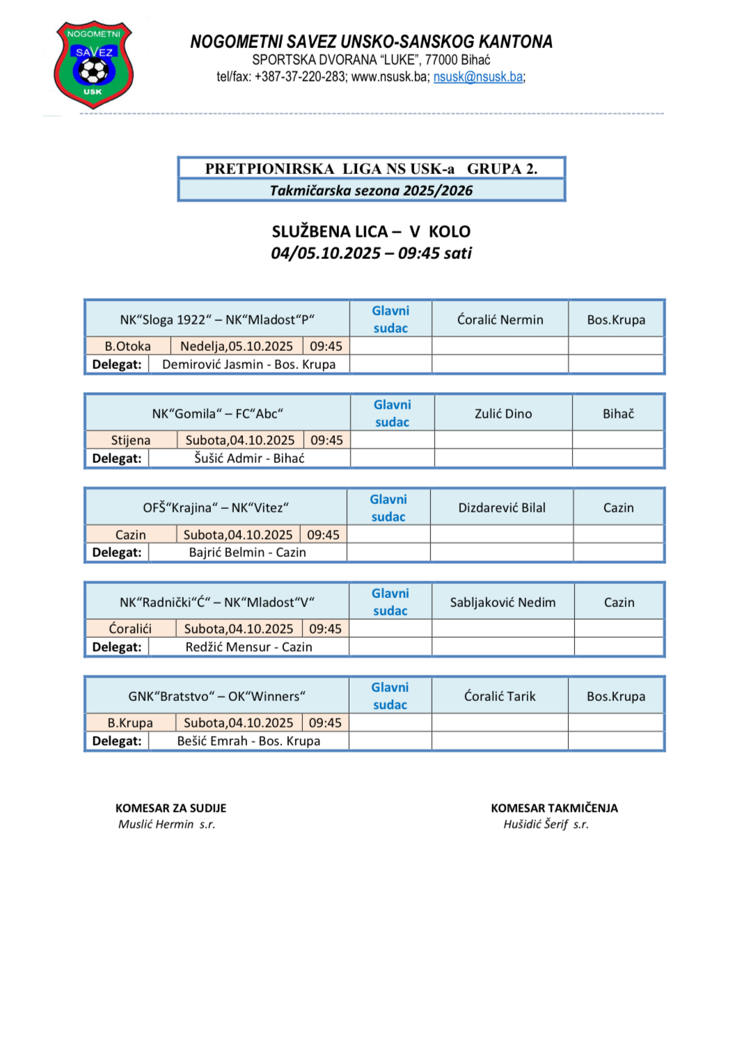 Nalozi službenih lica Kantonalna i Omladinska liga 2025/2026