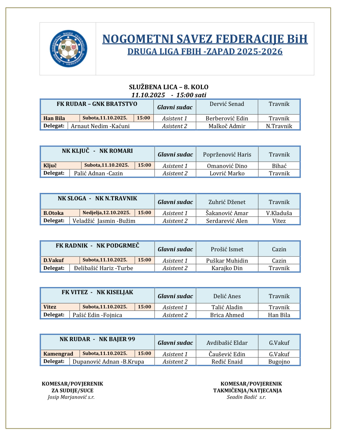 Delegiranje 8.kolo Druga liga NSFBiH Zapad