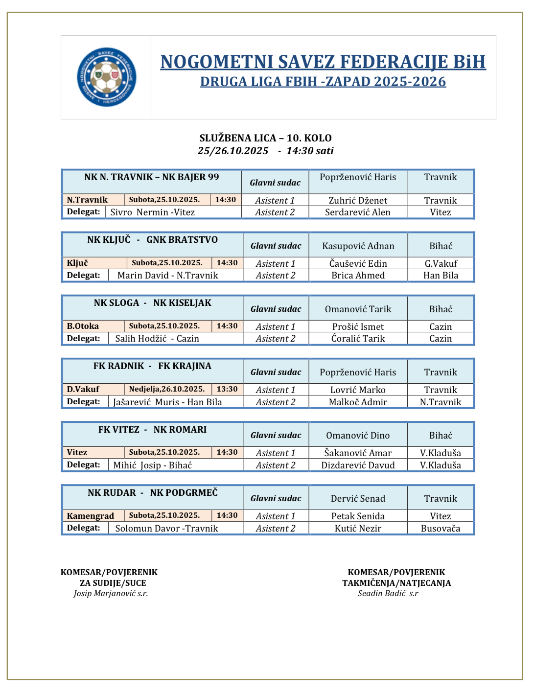 Delegiranje 10.kolo Druga liga FBiH Zapad