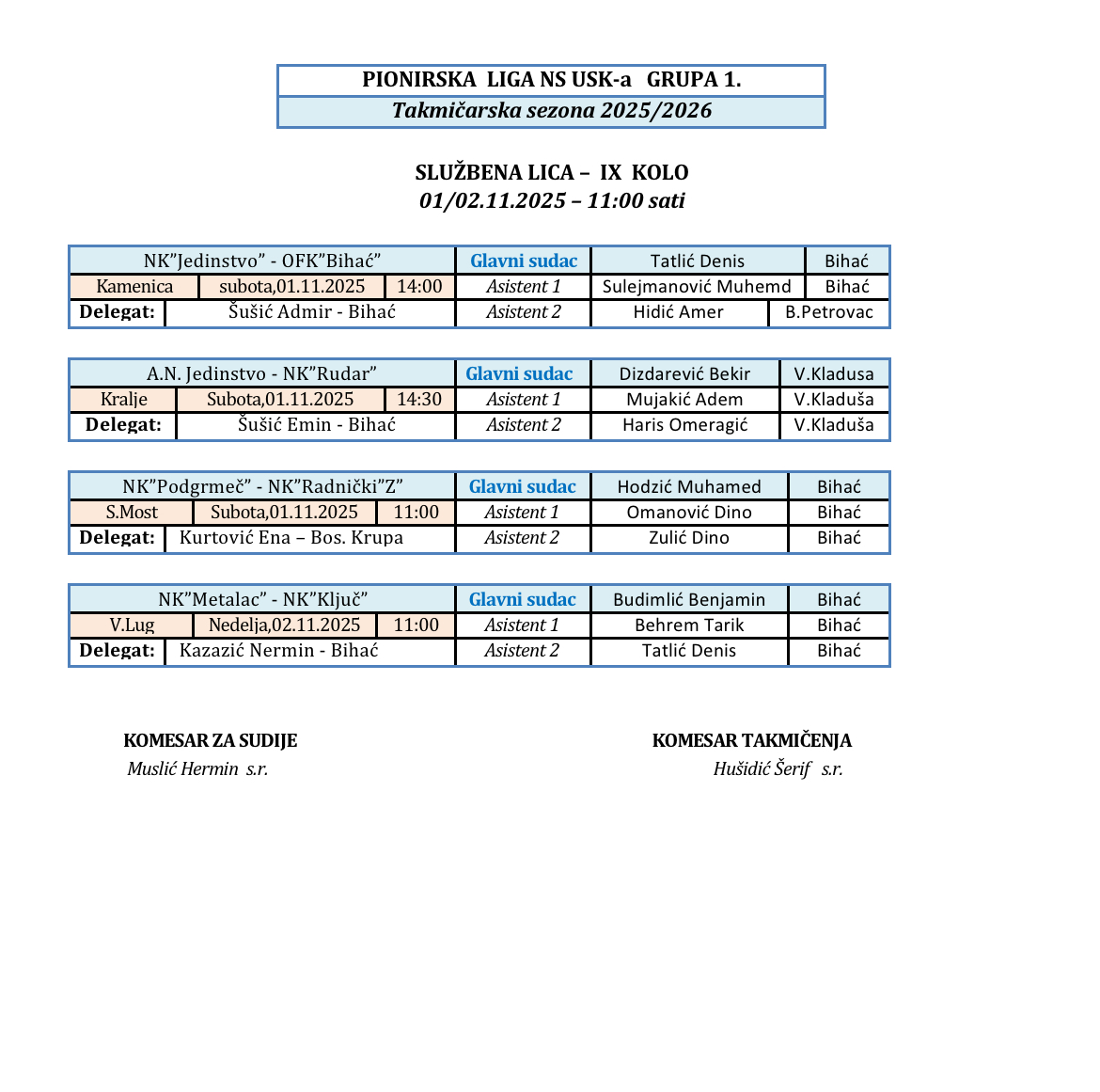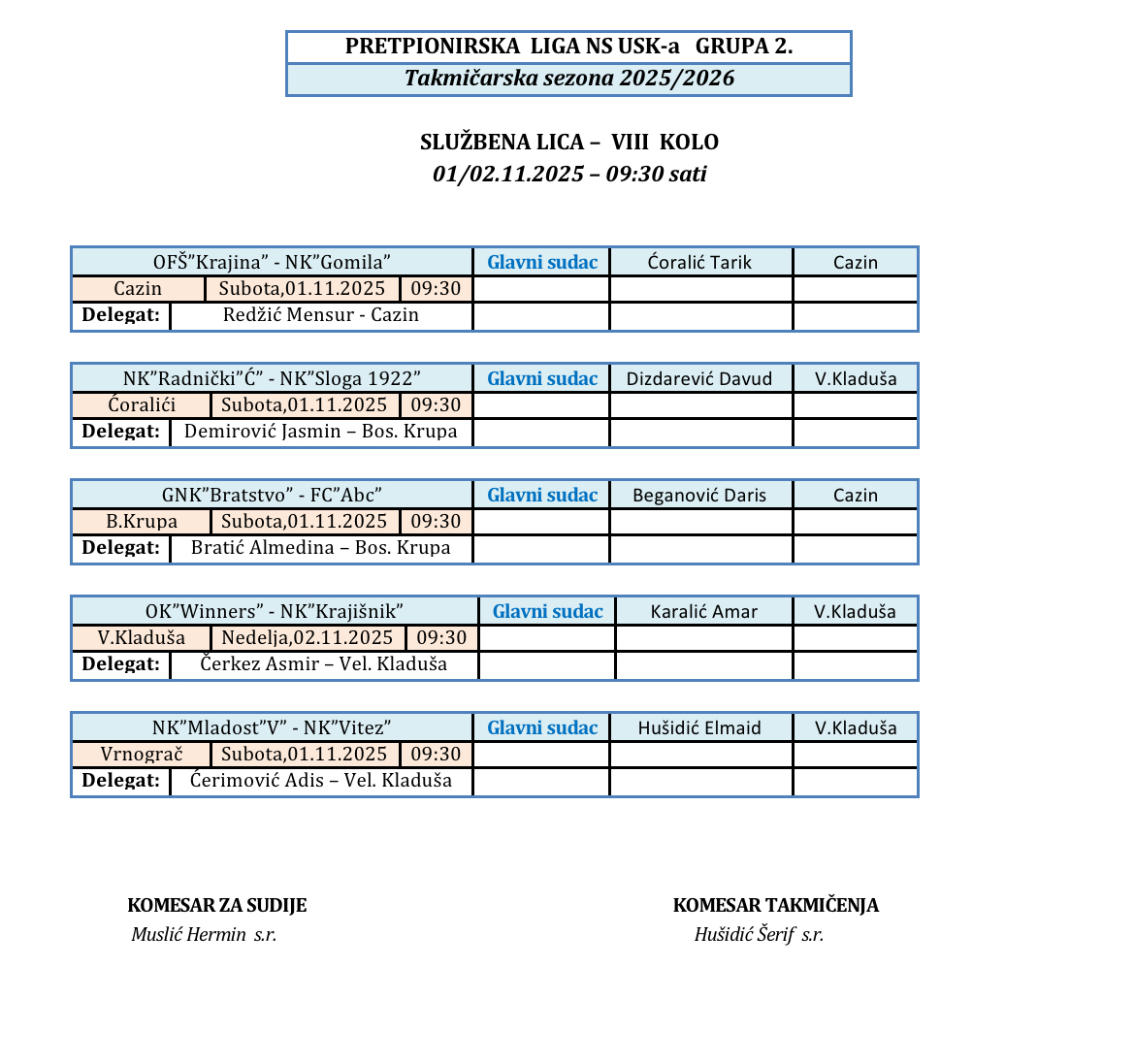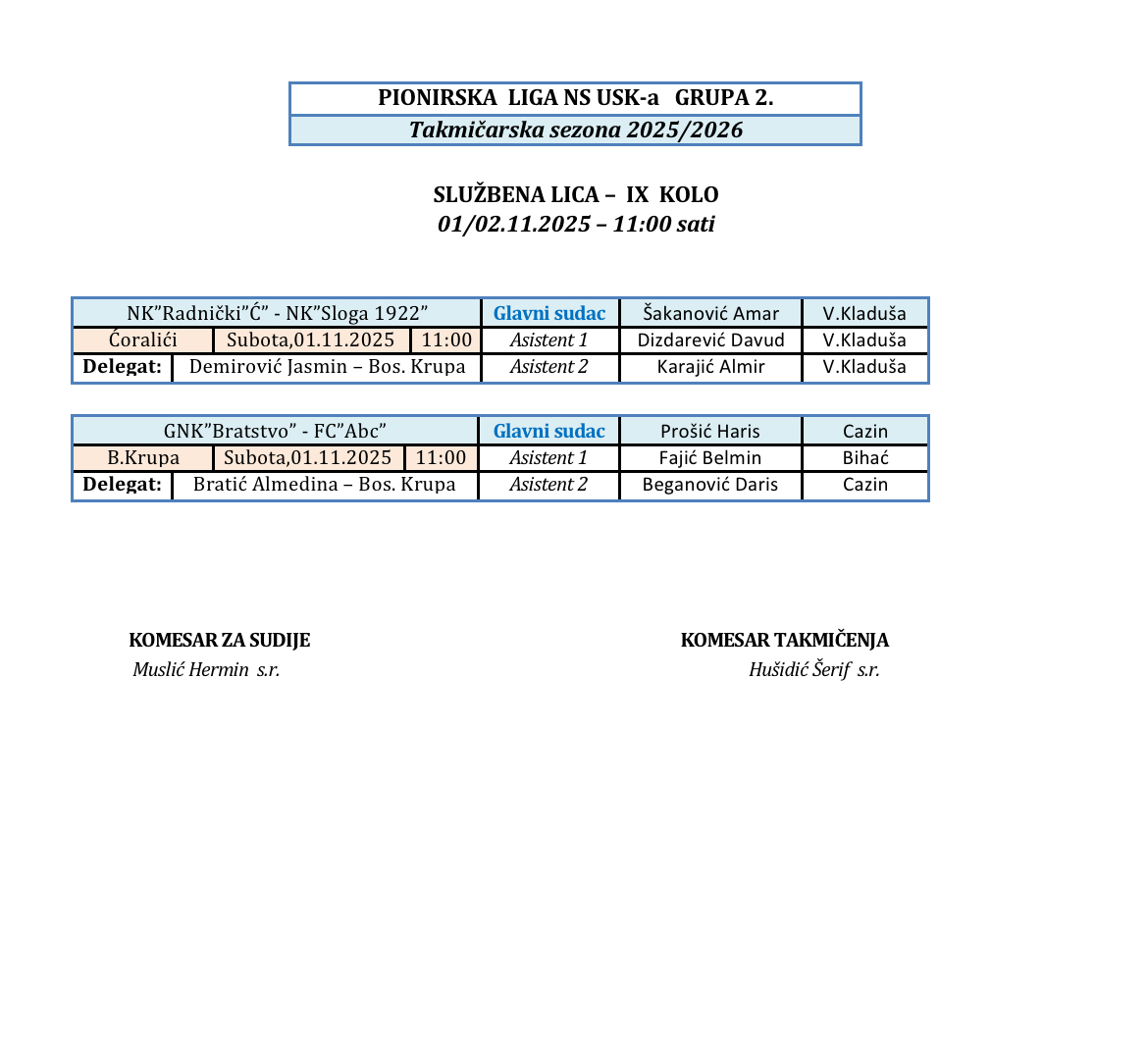 Nalozi službenih lica Kantonalna i Omladinska liga 2025/2026