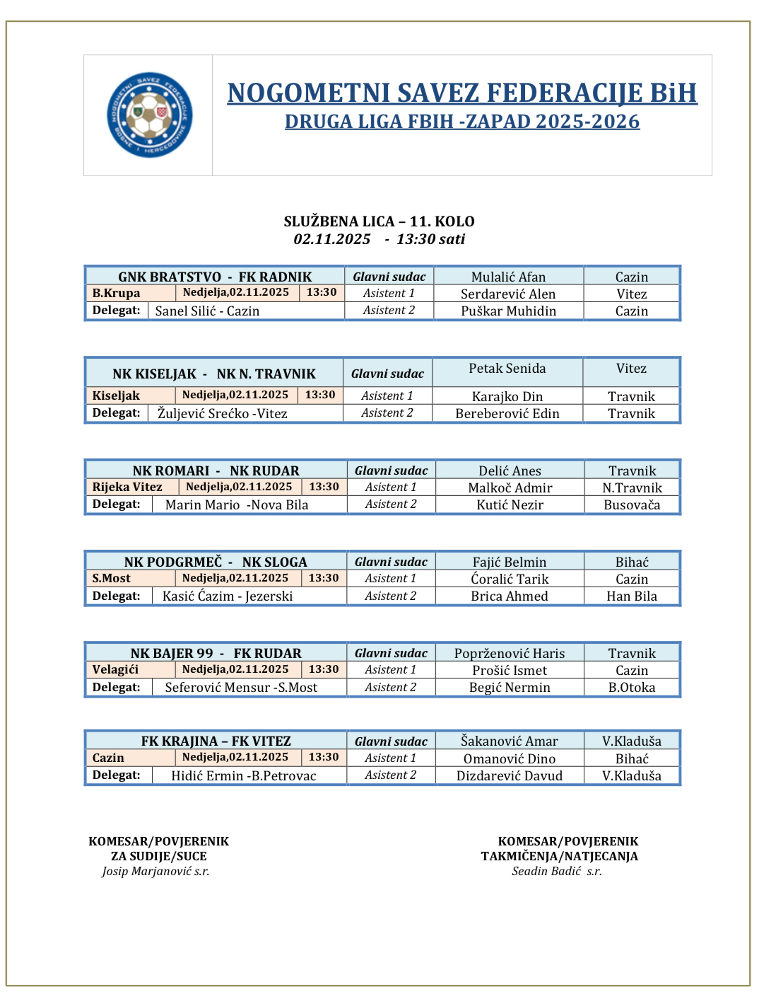 Delegiranje 11.kolo Druga liga FBIH Zapad