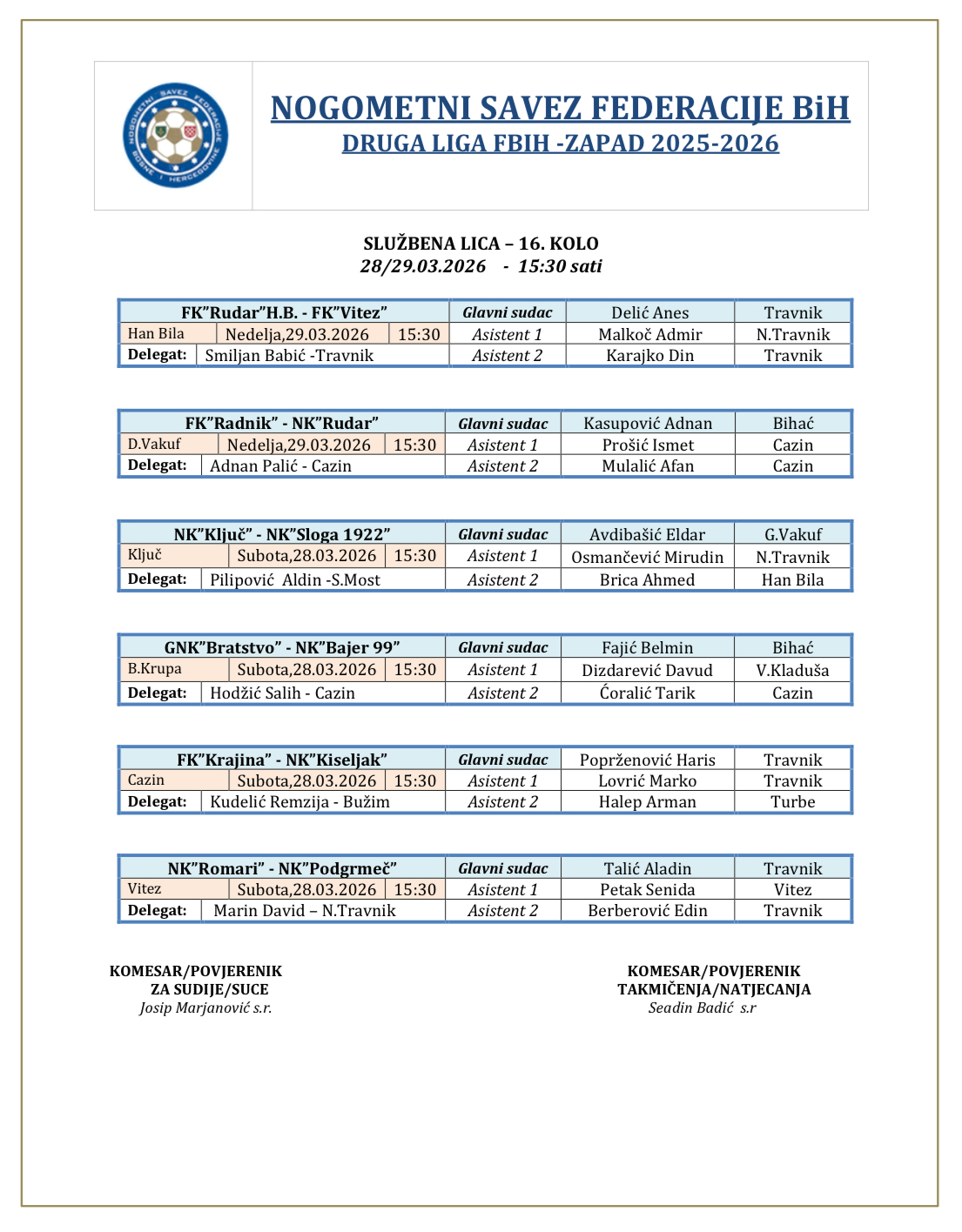 Delegiranje 16.kolo Druga liga FBiH Zapad