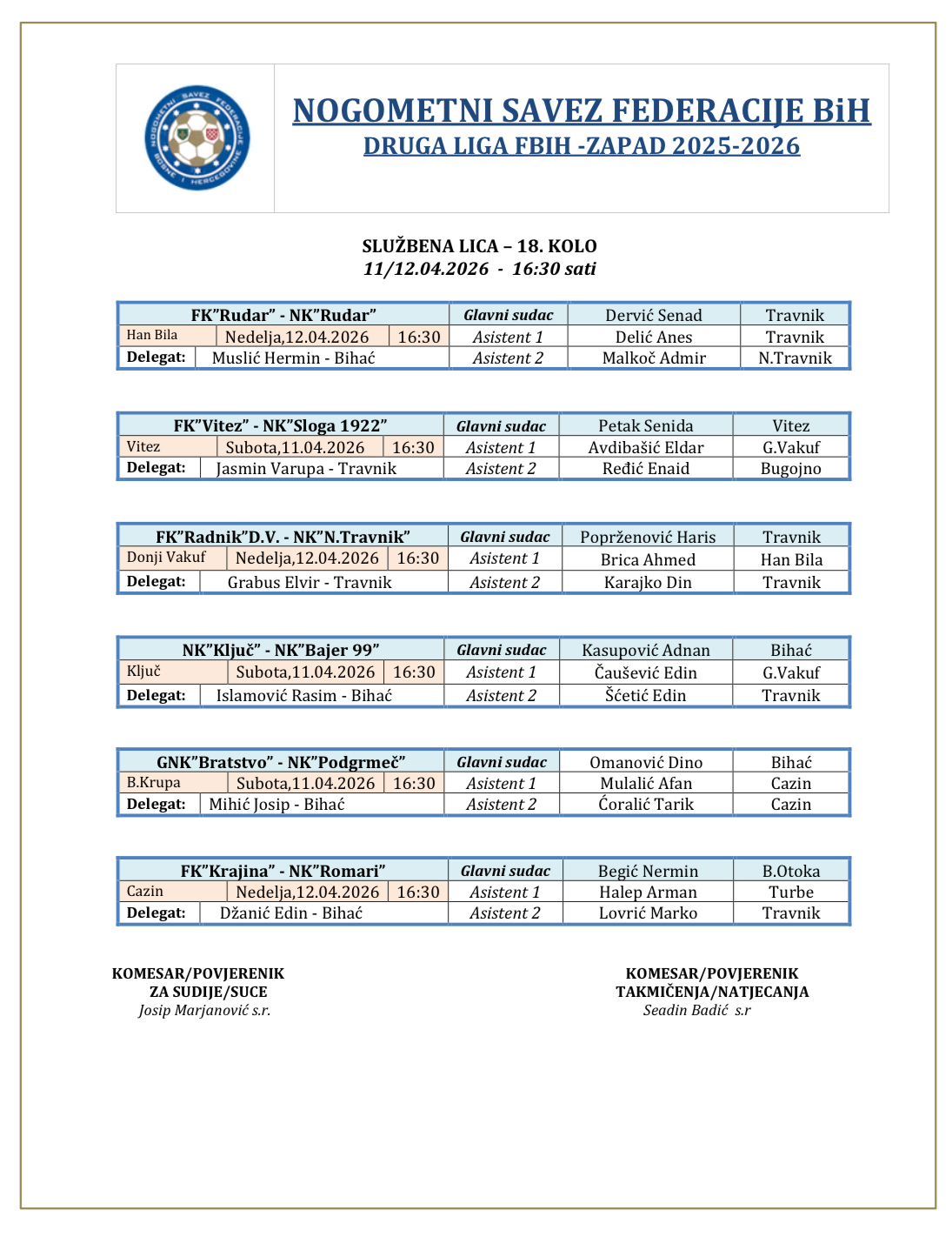 Nalozi službenih lica Kantonalna i Omladinska liga 2025/2026